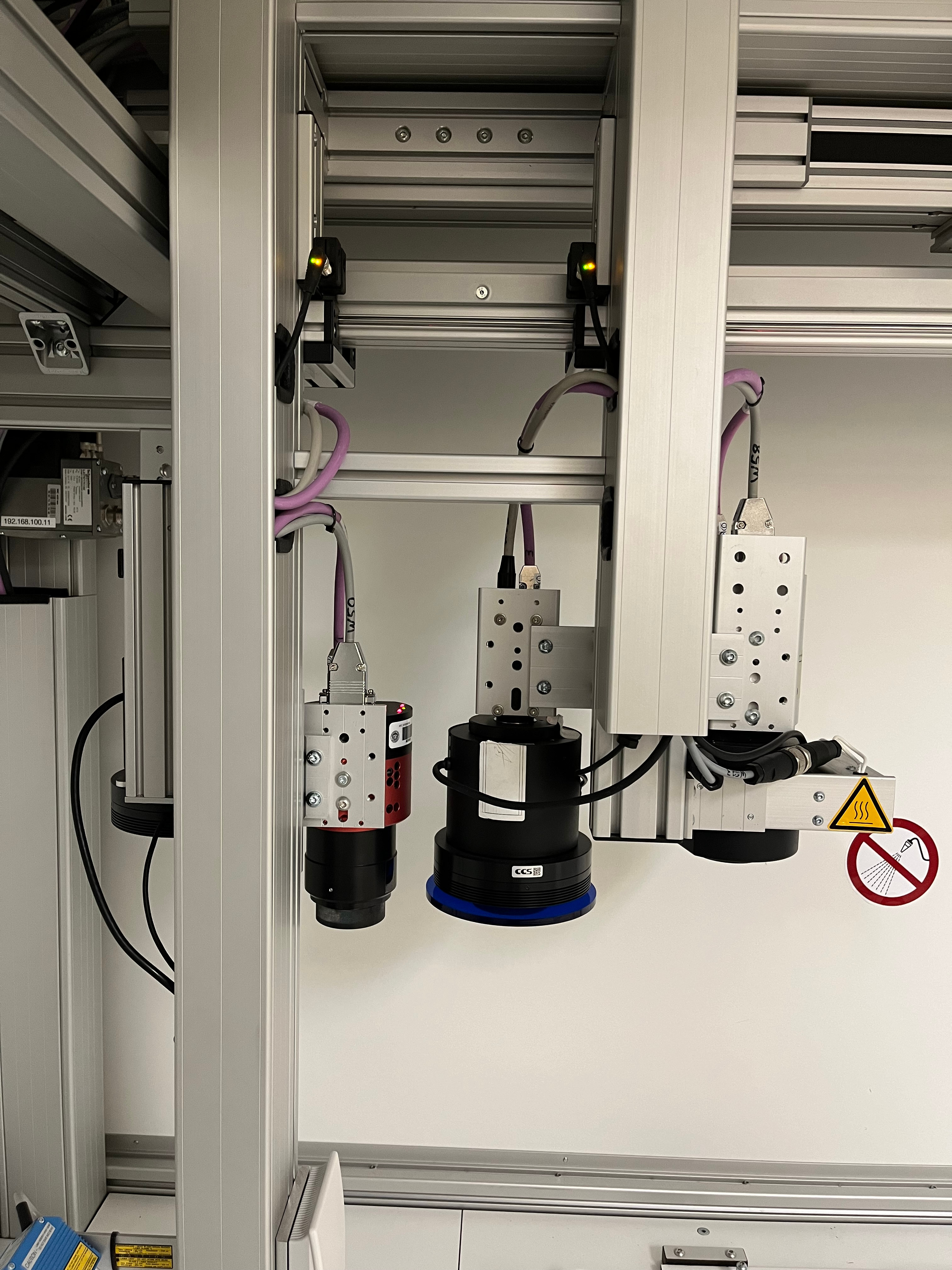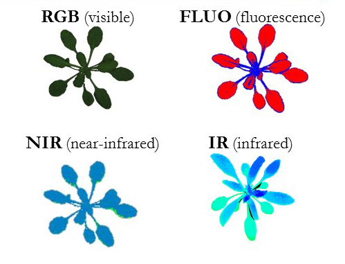 It is equipped with 4 different cameras [visible (RGB), fluorescence (FLUO), near infrared (NIR), and far infrared (IR)]. With the visible camera, it is possible to extract information about projected leaf area, caliper length, compactness and chlorosis; the fluorescence and near infrared cameras provide information about in planta chlorophyll fluorescence and water content, respectively and the infrared camera provides information about leaf temperature.